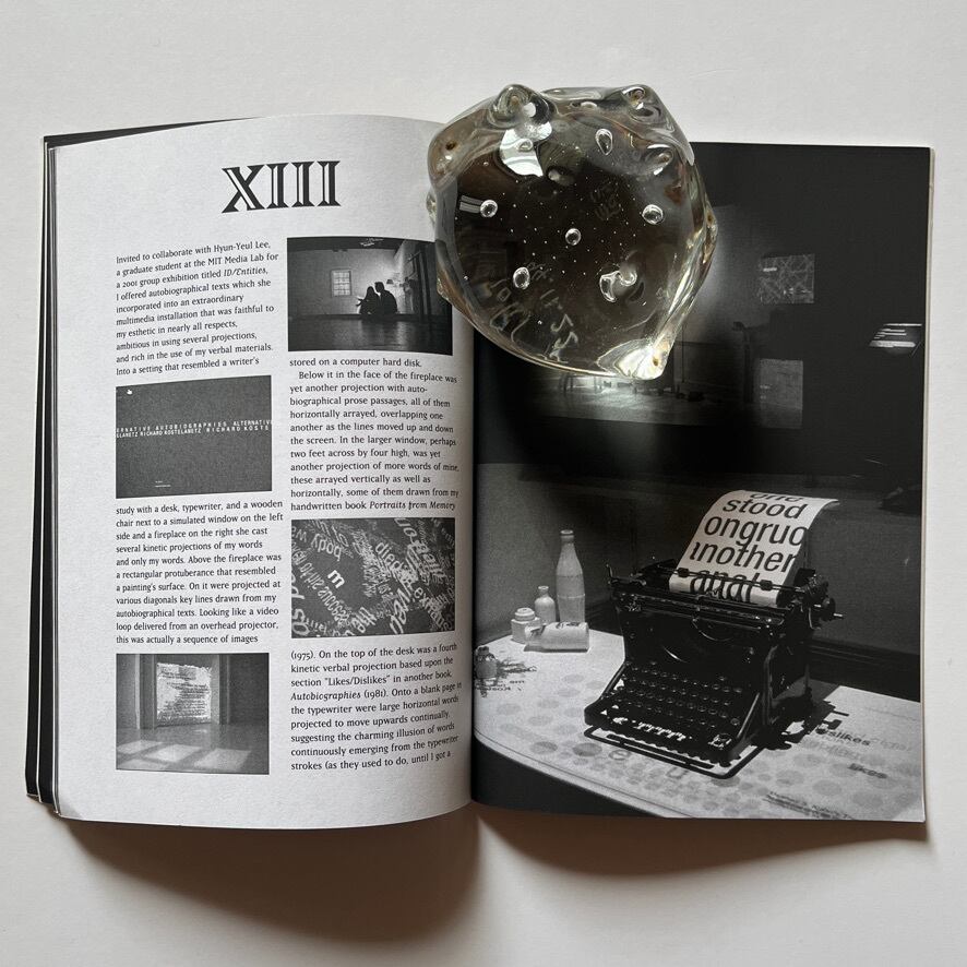 この本は、彼の過去35年間のVisible Writingについて本人が著した本です。グラフィックとテキスト満載。 15章にあって、彼のライフワークの原動力であり、現在も続いている言語を使った形式的、ビジュアル的、パフォーマティブな実験を再訪し、新たに掘り下げています。