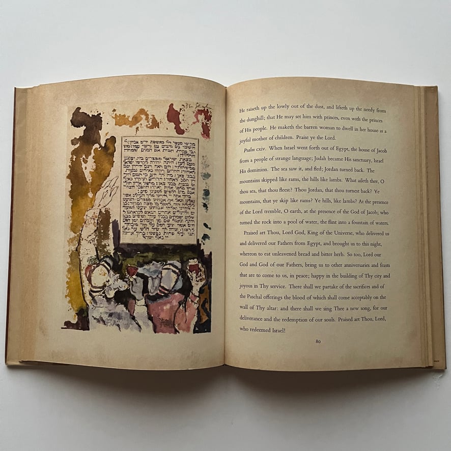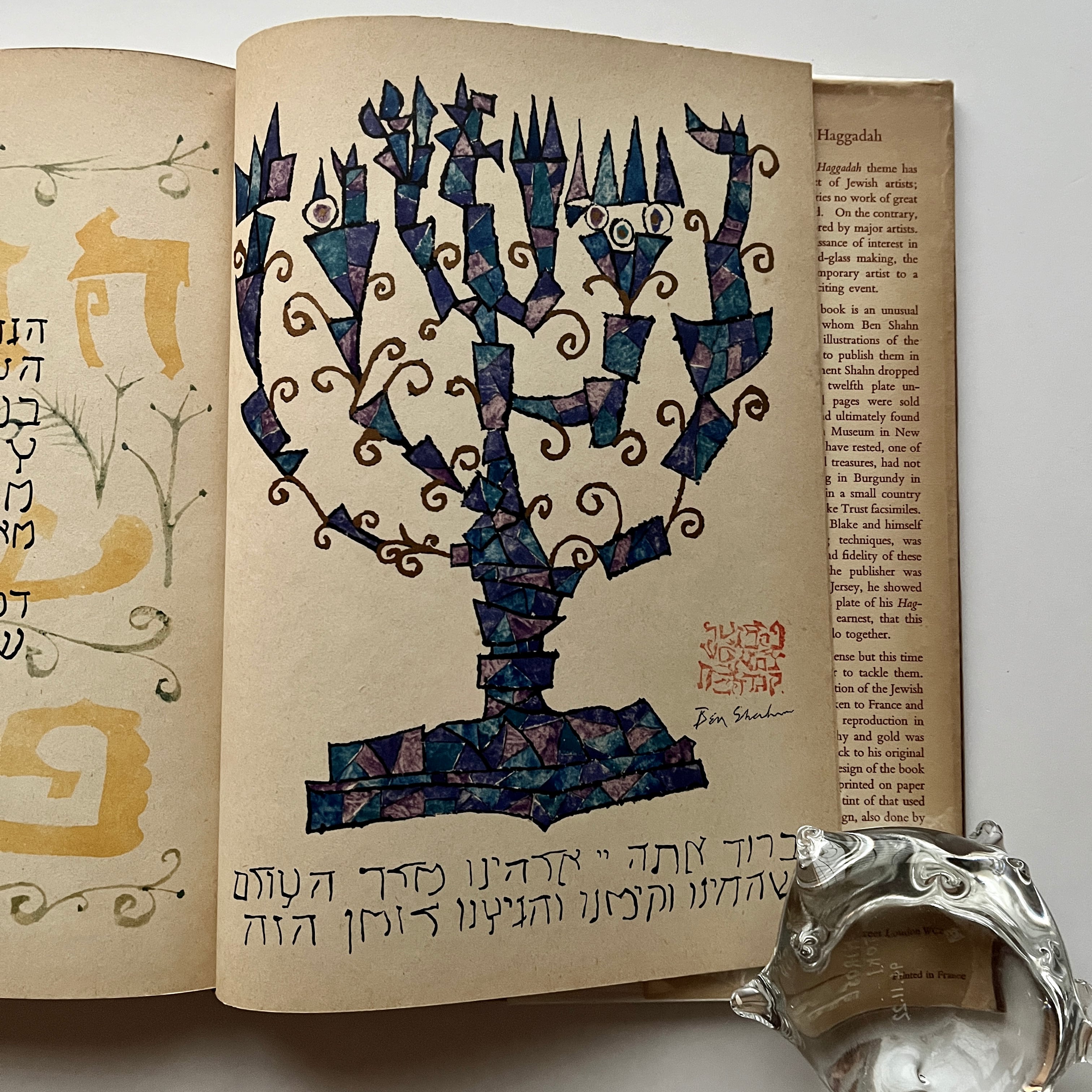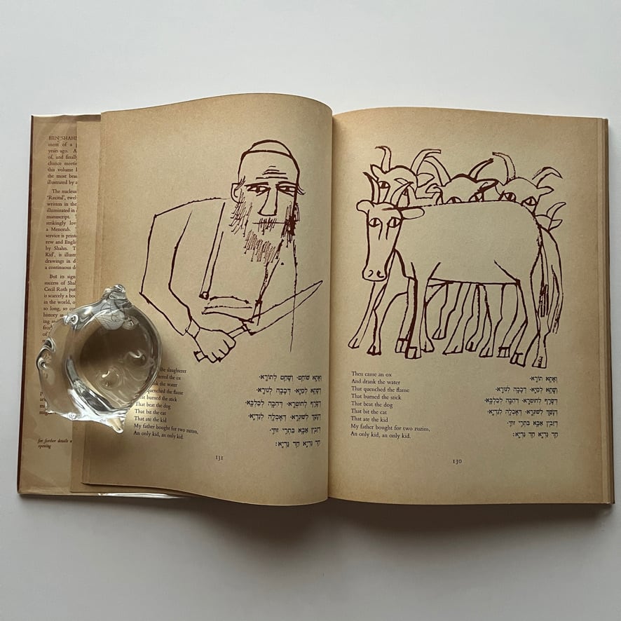 フォーカスはイギリスの学者セシル・ロスに序文と注釈の作成を依頼し(ロスが1934年に翻訳したハガダーのテキストも再利用しました)、1934年に翻訳したハガダーのテキストも再利用しました。出版当時「おそらくアメリカ人アーティストによってデザインされ、イラストが描かれた最も美しい本」と称賛されました。このシャーンのハガダーには豪華特装版もありますが、こちらは普及版。しかしながら、最後の燭台の作品は金彩もされており、落款とサインも入っています。