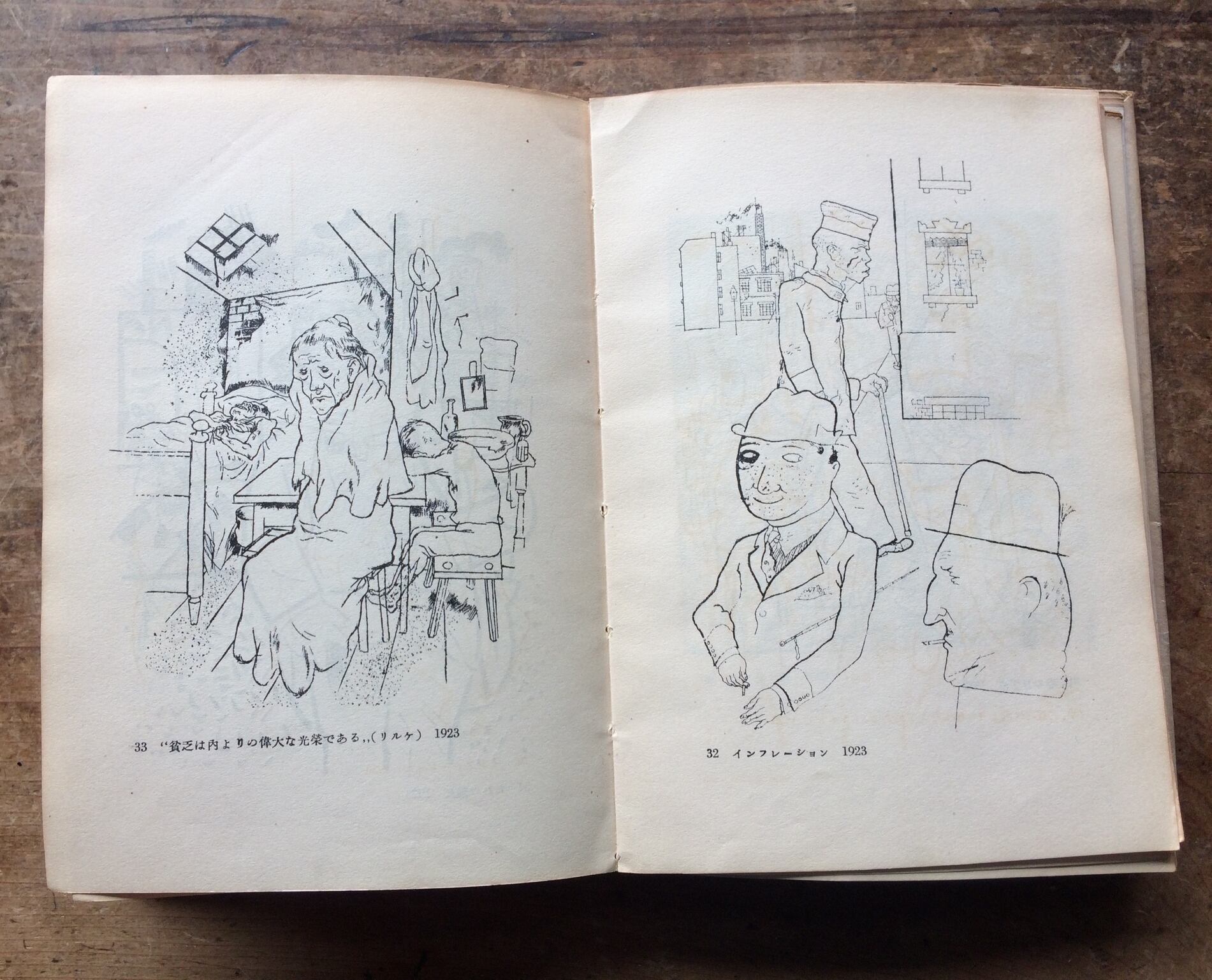 モノクロの印刷ですが、グロッスのイラストがページいっぱいの図版で紹介されています。後半は、グロッスとも親交があった村山知義氏が、グロッスの作品との出会い、作品と人となりについて書いています。