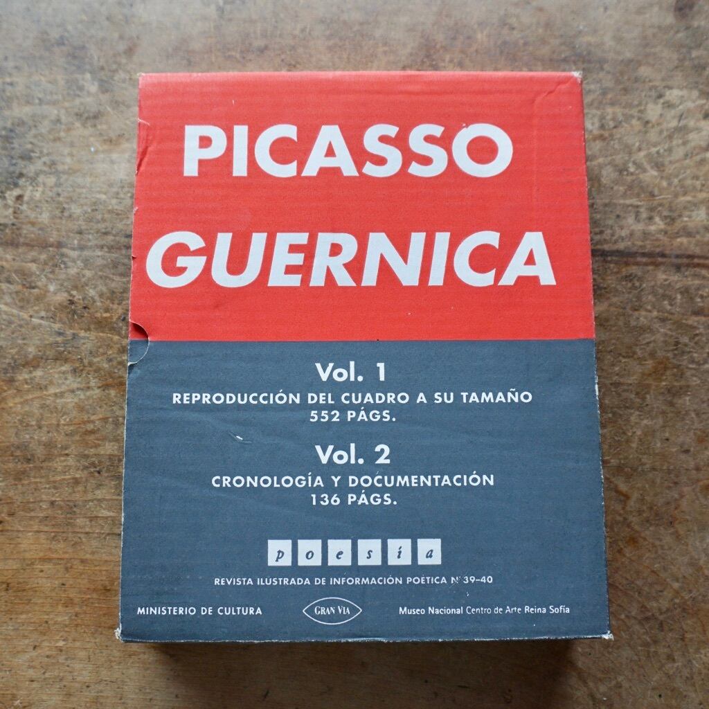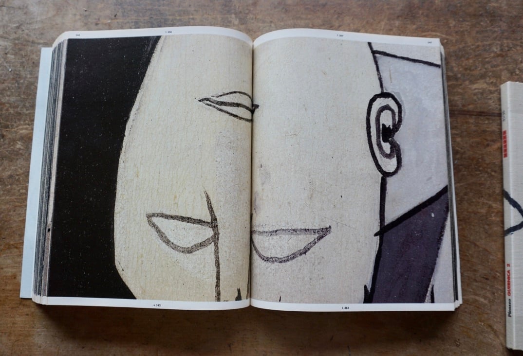 そして、こちらの本は、ゲルニカの原寸をページサイズに分割して一冊に綴じたという驚くべき一冊。写真を観ていただくと、冒頭黒っぽいページが続きます。時々もしかしたらあの部分?と思しきディティールも出てきますが、確信は持てないまま・・・