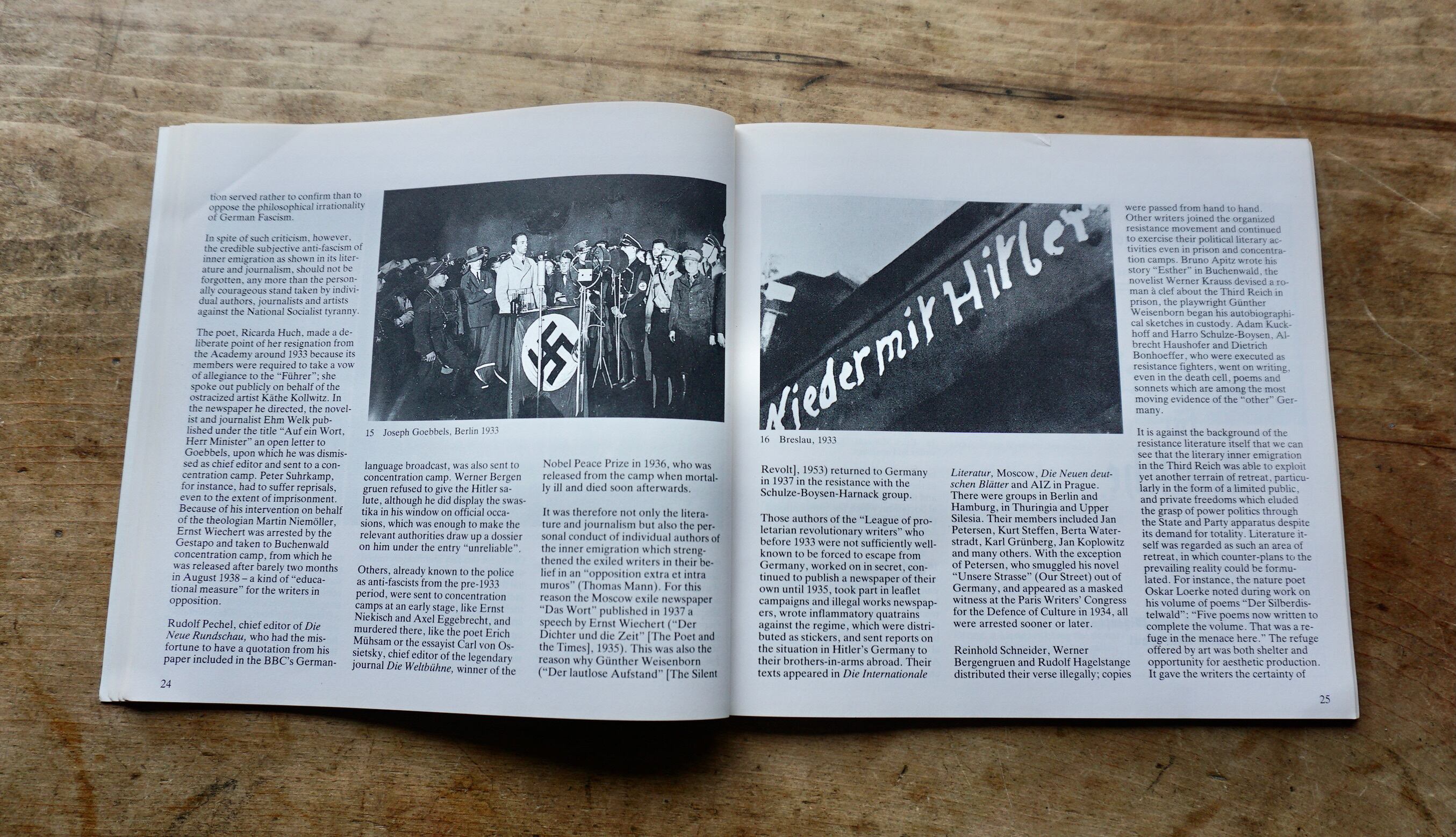 "ここ数十年の間に、ドイツのレジスタンスについて多くの本が書かれてきました。1944年7月20日から40年目の今年は、海外ではあまり知られていない、その闘いにおける作家や芸術家の役割を扱う機会になるかもしれない。彼らとナチスの独裁者が最初からお互いを不倶戴天の敵とみなし、宣戦布告したことは名誉なことである」。-- ゲルハルト・シェーンベルナーによる序文より。