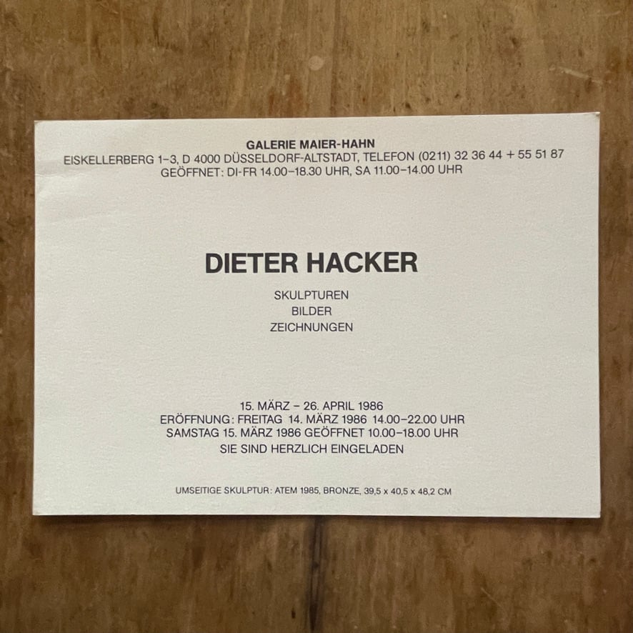 1987年に GALERIE MAIER-HAHNで開催されたDIETER HACKERの彫塑・絵画の展覧会のアナウンスメントカード。