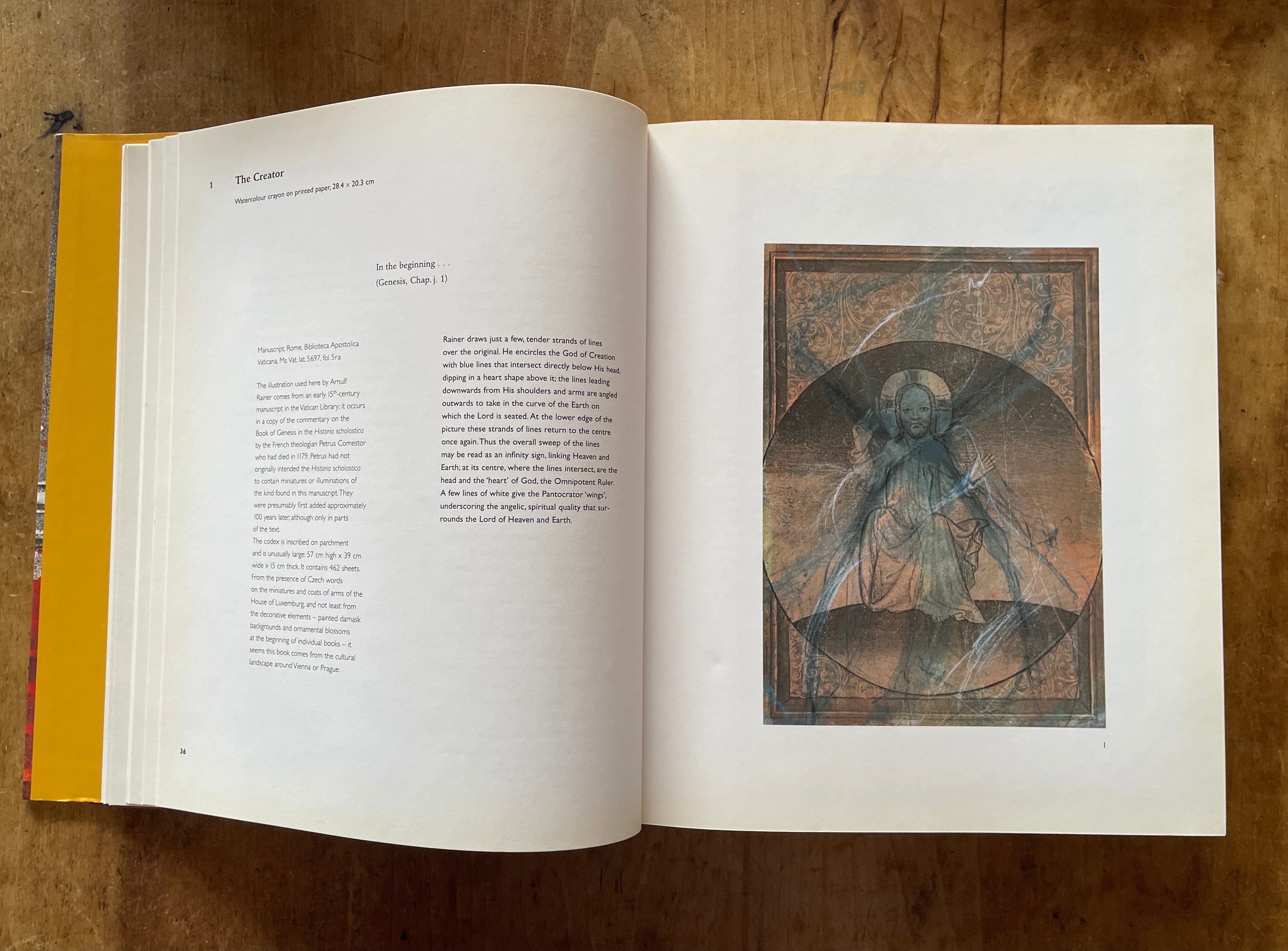 その制作スタイルは既存の写真やプリントの「上に」描くドローイング「オーバーペインティング」によってヨーロッパ美術にまったく新しい道を切り開きました。この本は、ライナーの制作歴でも比較的新しいもので、1995 年から1998 年にかけて、10 世紀から19世紀のの装飾写本にオーバードローイングを施して、一連の聖書の挿絵シリーズを制作しました。