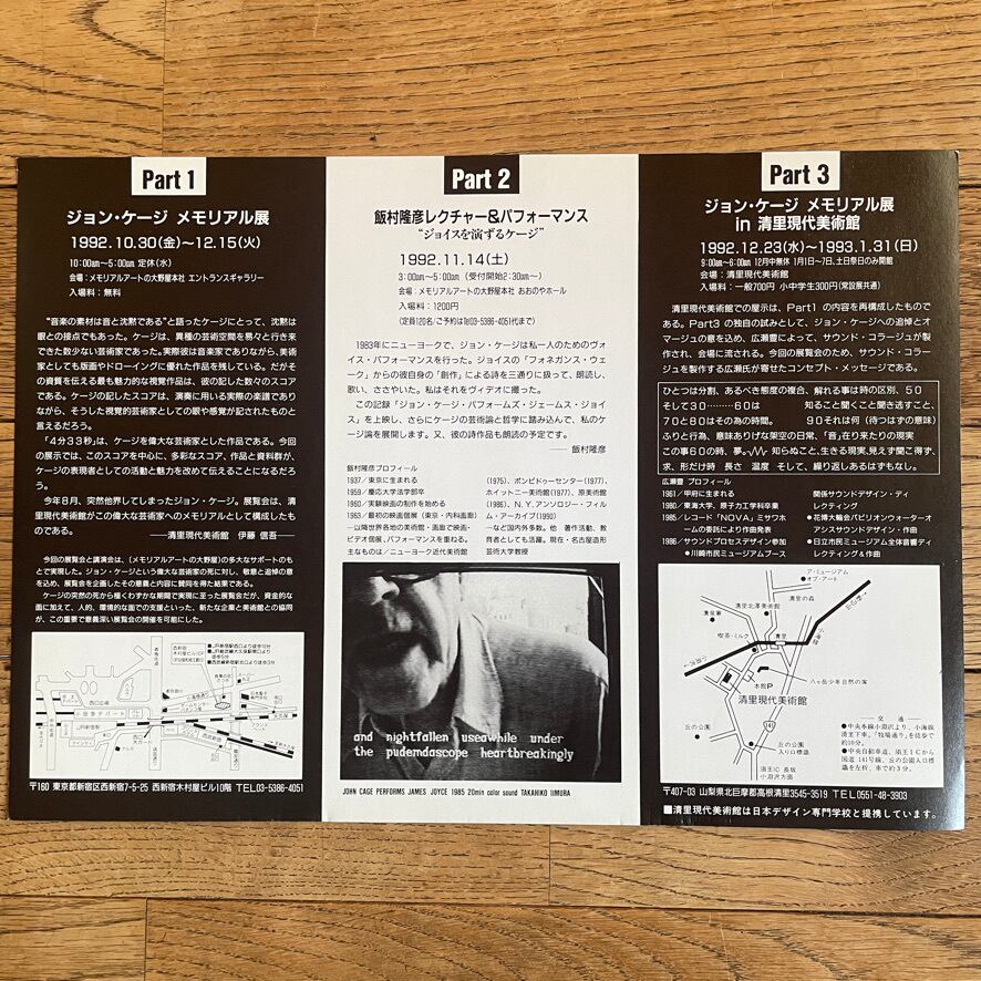当時メモリアルアートの大野屋と業務提携しており、時期をずらして展示会場が西新宿のメモリアルアートの大野屋、清里現代美術館の2箇所で。飯村隆彦さんのレクチャー&パフォーマンスはおおのやホールで開催されました。