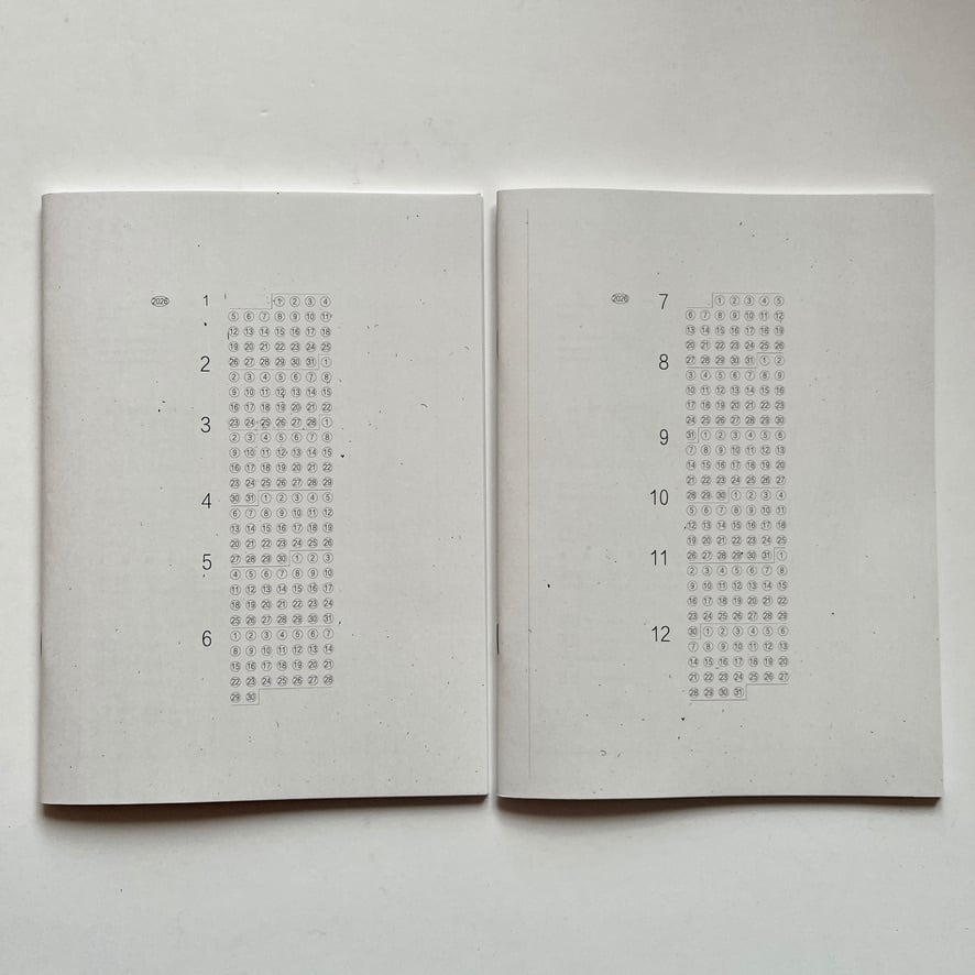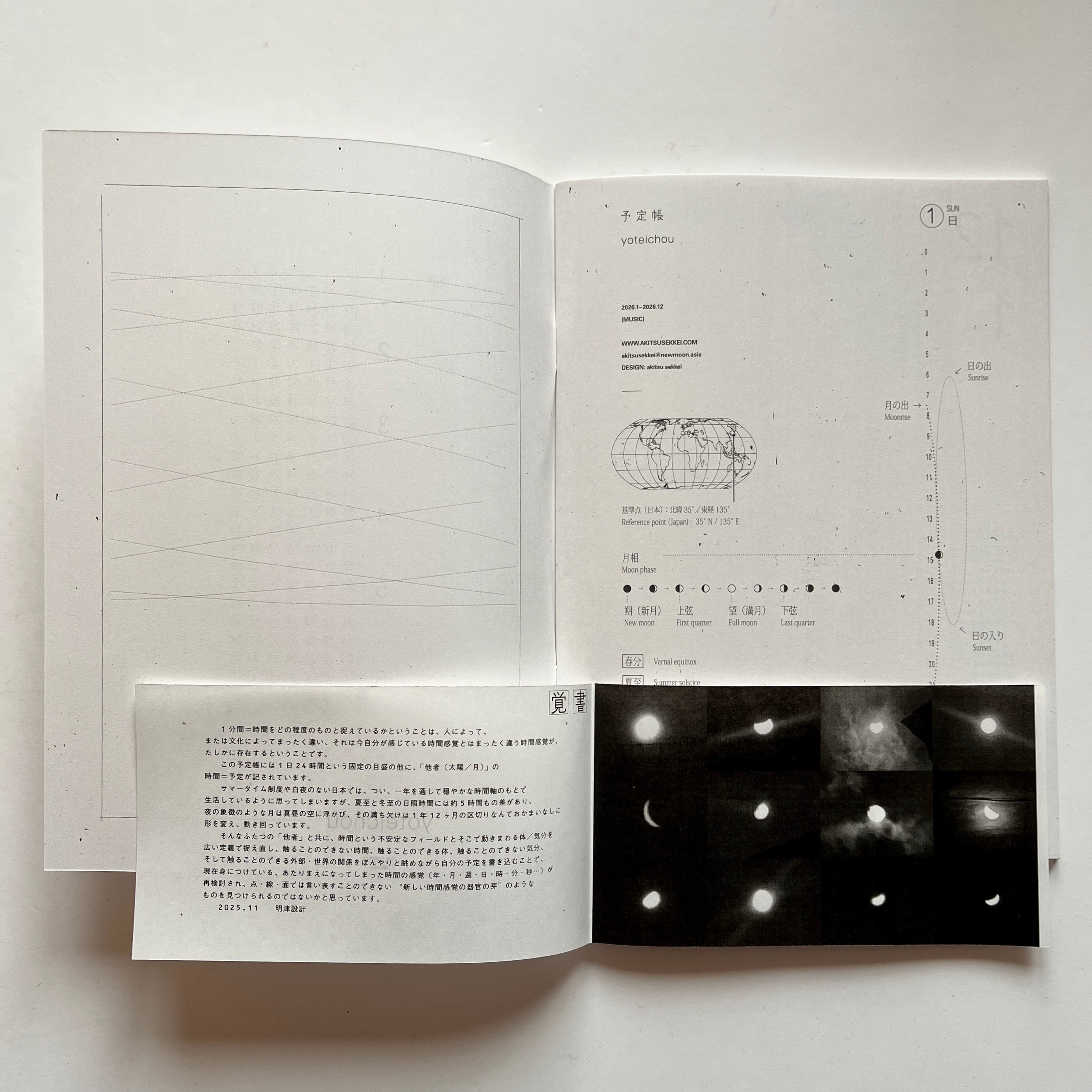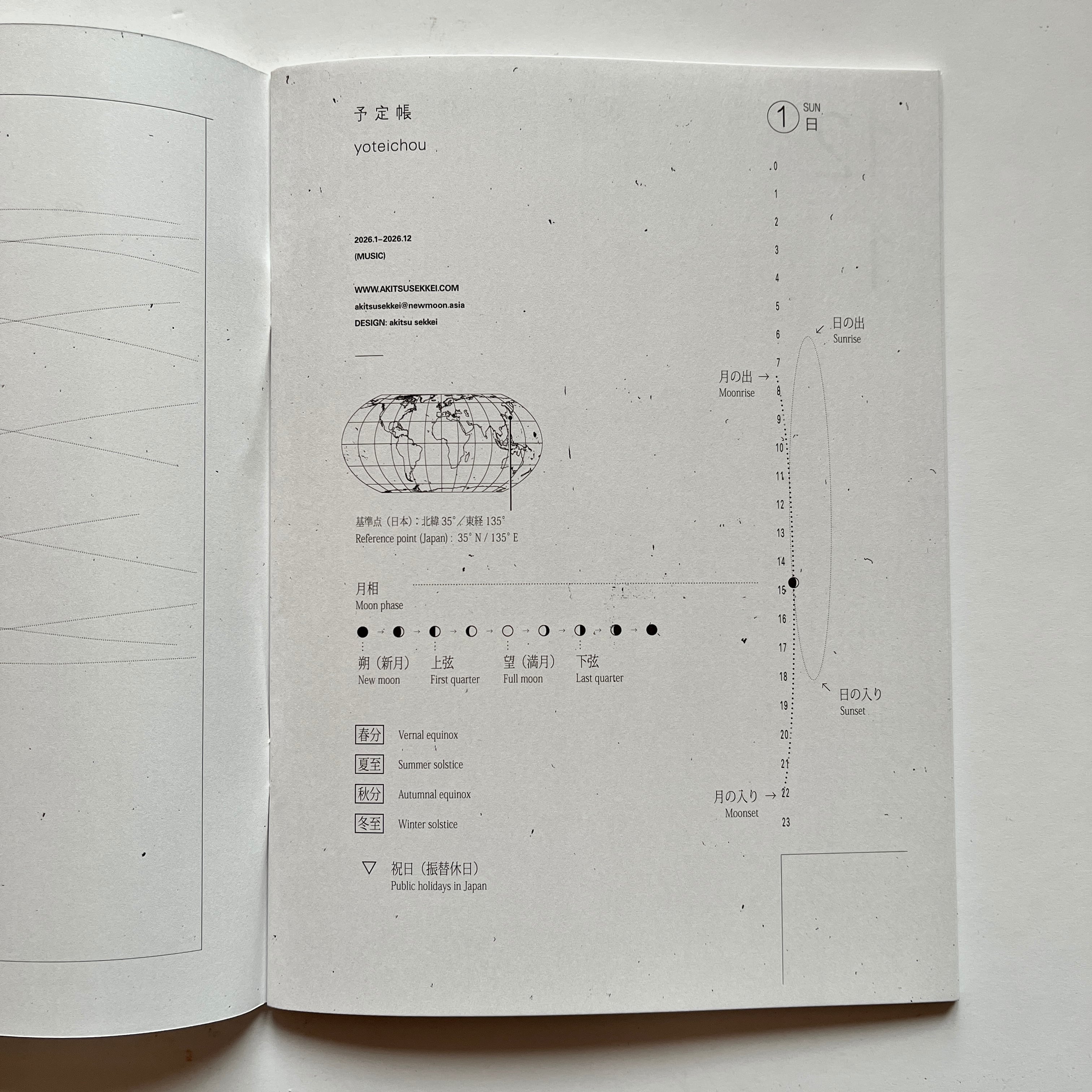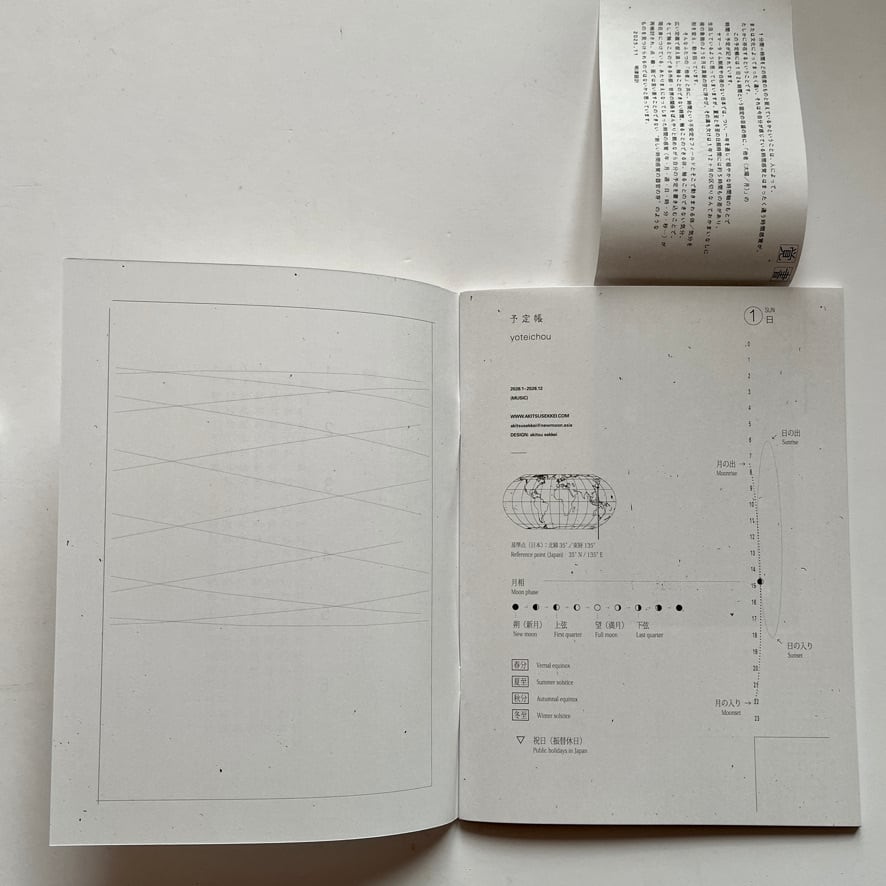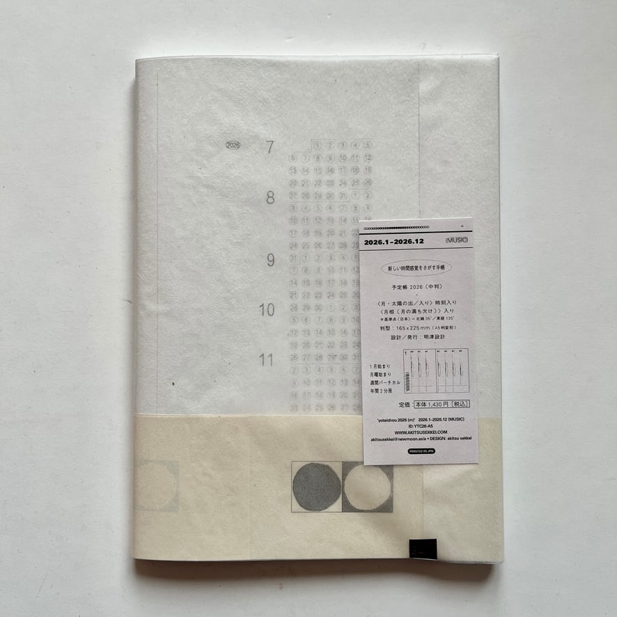デザイン/発行を手掛けるグラフィックデザイナー・明津設計(浅田農)が、「自分が使う手帳を、自分でつくる」ことをきっかけにして作られた予定帳/予定表は、“新しい時間感覚をさがす” をコンセプトに、1日24時間というタイムラインの他に、月と太陽のスケジュールが視覚化されています。 時間の捉え方は、土地、文明、文化、あるいは生き物によってまったく異なります。それは、つまり自分がいま感じている時間感覚とはまったく違う時間感覚が、たしかに存在するということです。 自分とは異なる時間軸を感じながら生活することで、いま身につけている時間感覚(年・月・週・日・時・分・秒…)はやさしく解体され、時間に追われるのではなく時間の中を自由に散歩してゆく感覚になることを目指し作られた手帳です。