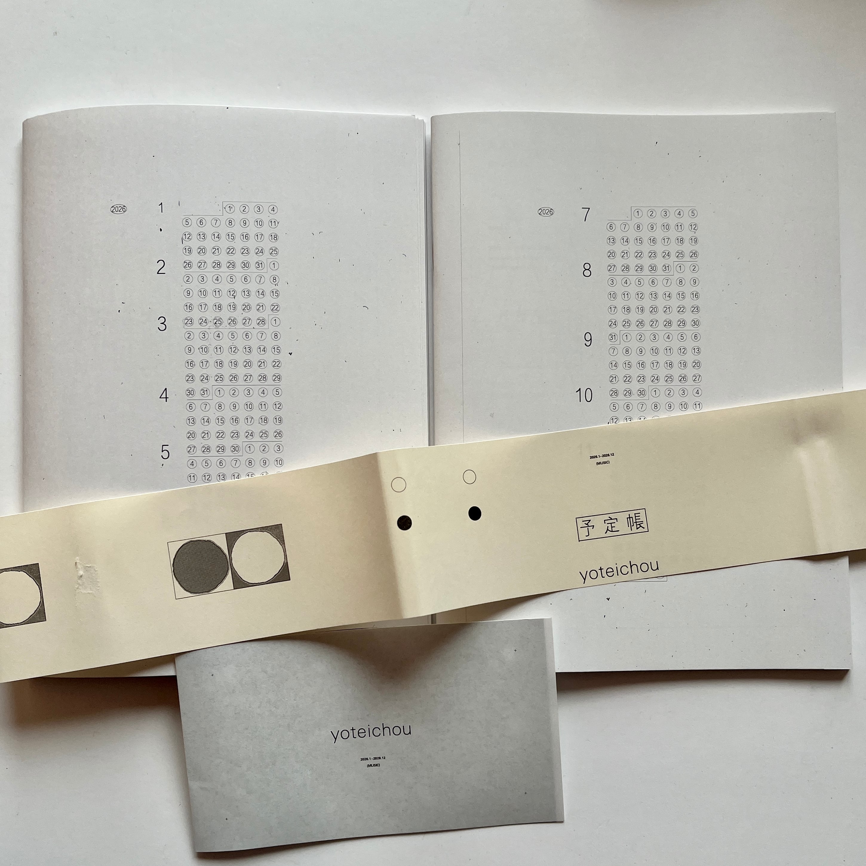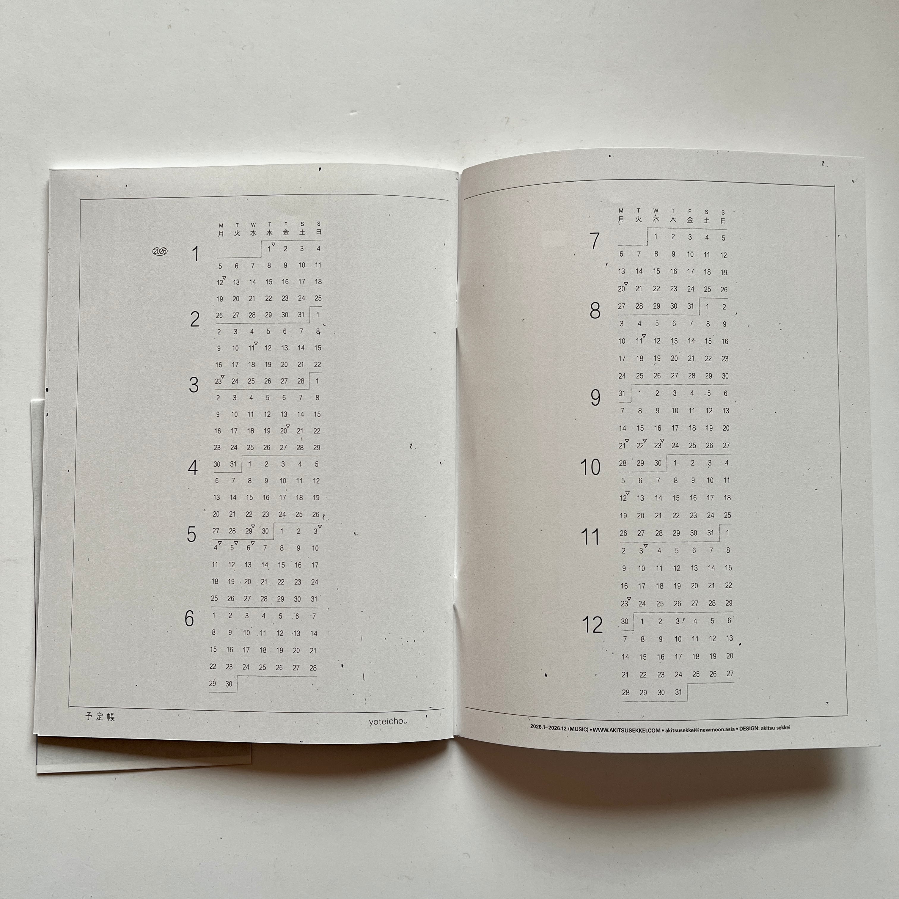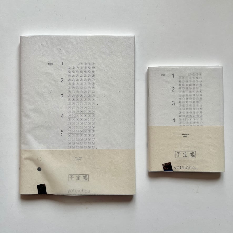 ・最小限の軽さ___手帳についているメモのページは、1年間使うには少なく…、まったく使わない人にとっては必要がない…と考え、スケジュールページ以外を最小限まで減らしました。また、1年前の予定を見返す機会は少ないと感じたため、6ヶ月で1冊ずつの、2分冊になっており、非常に軽く、薄い手帳となりました。