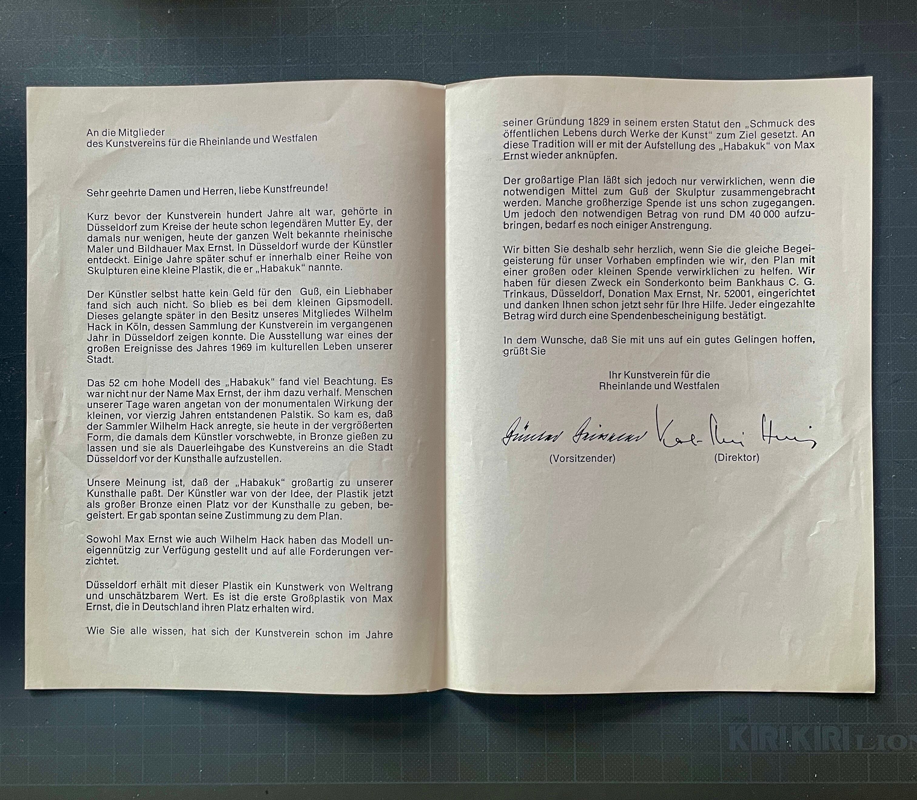 „Habakuk"の彫刻を設置するための寄付を募るエフェメラです。