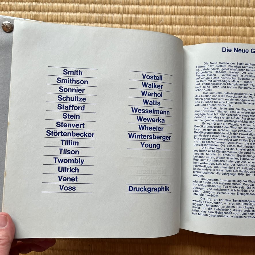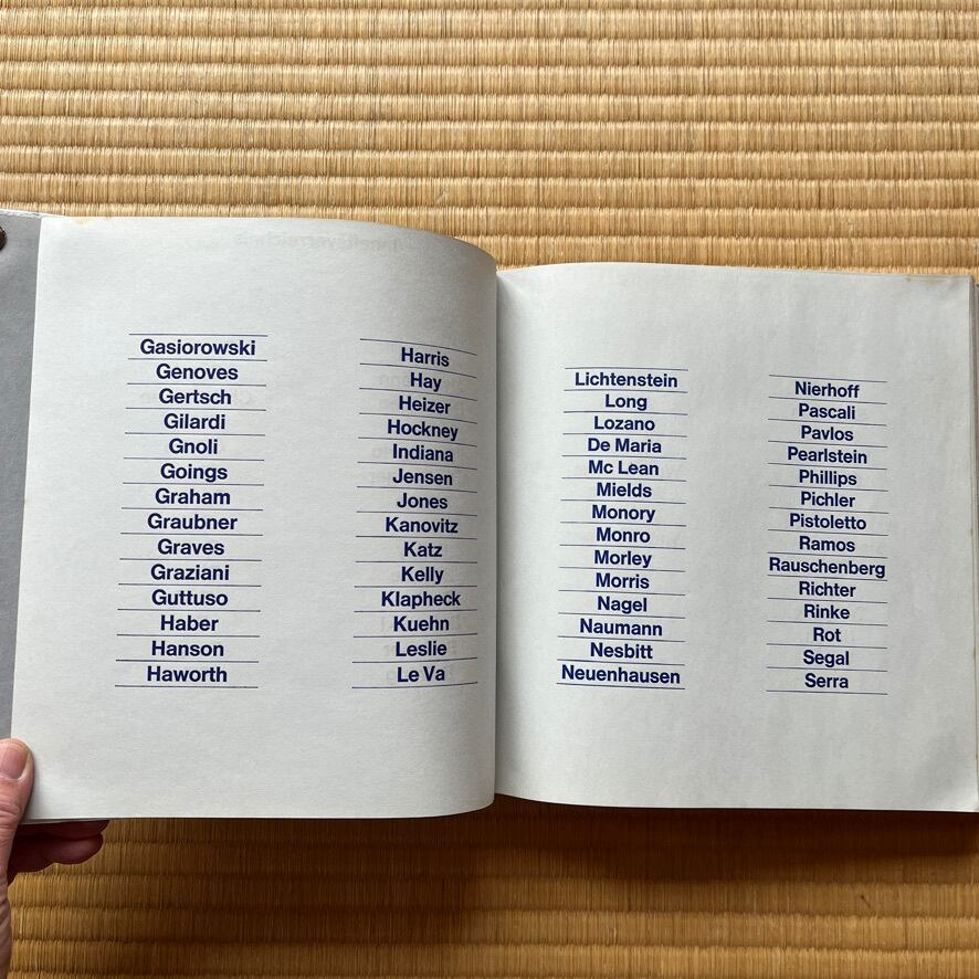 厚手なボードでできた前表紙はデュアン ハンソンのホログラフィック作品がボルトで留められています。とてもオブジェ的です。ピーター ルートヴィヒとヴォルフガング ベッカーのインタビューが含まれています。アルファベット順に並べられているアーティストの経歴と展覧会の年表も含まれています。